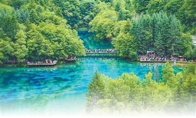 游客在九寨沟景区五花海游览。
