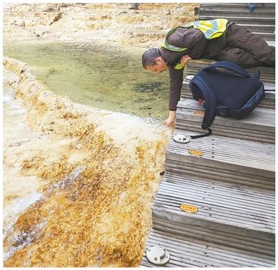 中克科研人员忙碌的身影同样出现在普湖公园的木栈道上、溪水旁边。他们共同修复出现细微裂缝的钙华坝,合作测量湖水悬浮颗粒物和碳酸钙微粒浓度变化。“钙华不是静止的岩石,而是可以‘生长’的活体系统。”参与项目的类延宝介绍,“我们的目标是帮助它自我恢复。”