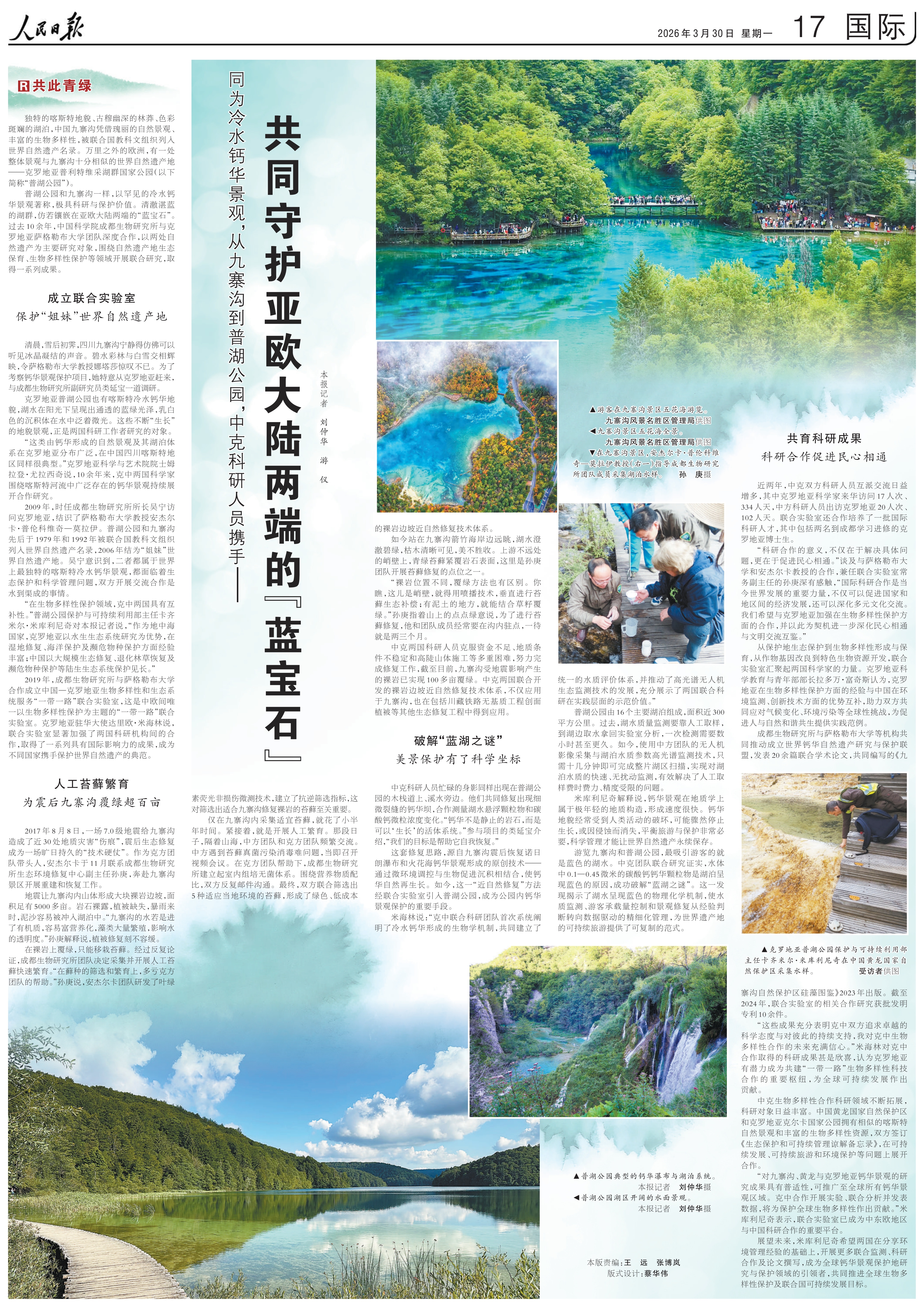 普湖公园和九寨沟一样,以罕见的冷水钙华景观著称,极具科研与保护价值。清澈湛蓝的湖群,仿若镶嵌在亚欧大陆两端的“蓝宝石”。过去10余年,中国科学院成都生物研究所与克罗地亚萨格勒布大学团队深度合作,以两处自然遗产为主要研究对象,围绕自然遗产地生态保育、生物多样性保护等领域开展联合研究,取得一系列成果。