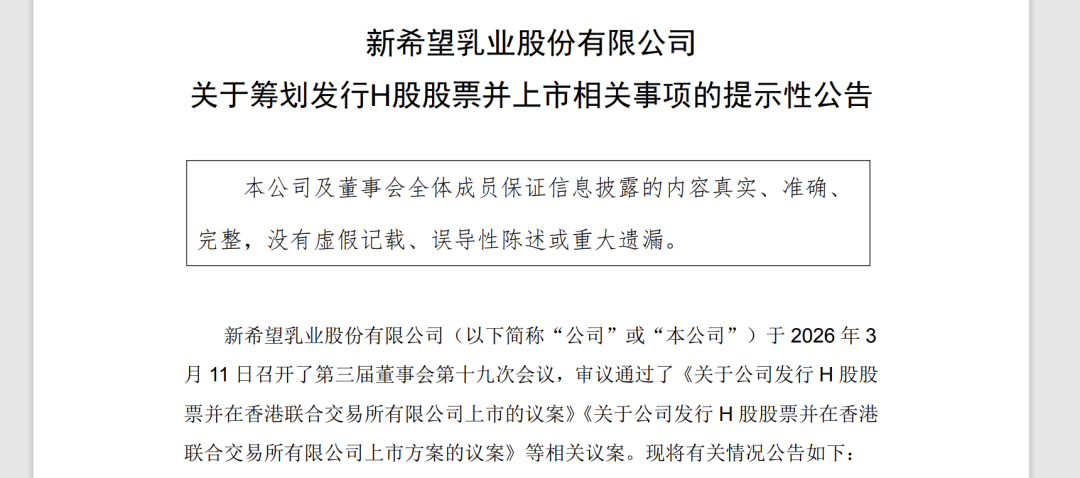 微成都报道 3月12日,新希望乳业股份有限公司(下称“新乳业”;002946.SZ)发布公告称,公司拟发行境外上市外资股(H股)股票,并在香港联交所主板挂牌上市。