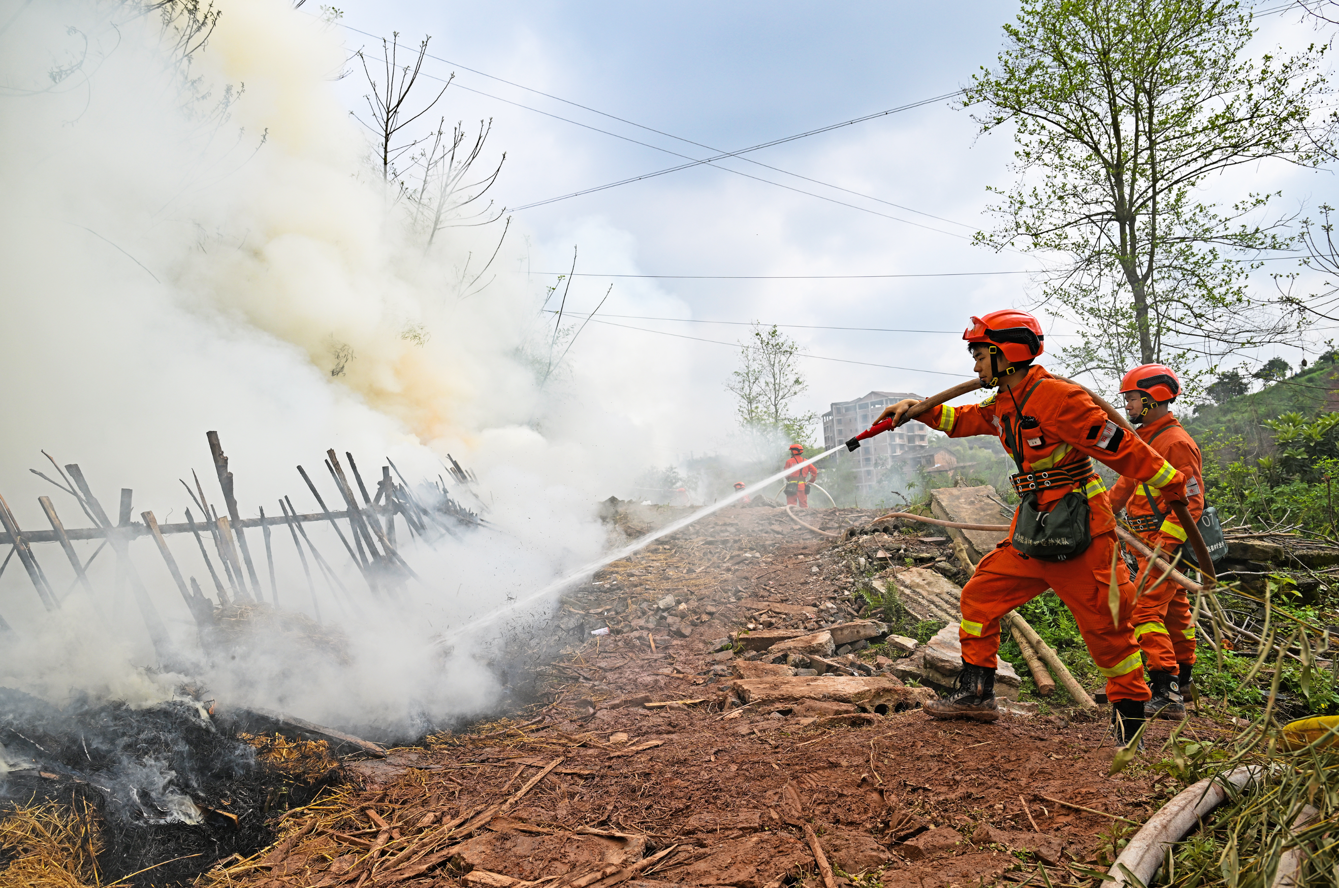 在火场的攻坚一线,重庆合川、达州两支队伍紧密配合。他们采取“以水灭火+常规扑打”相结合的科学战术,一边利用大功率水泵、移动水炮对火头实施精准压制,阻断火势蔓延路径;一边组织经验丰富的攻坚队员,使用风力灭火机、二号机具等装备,对地表火、暗火开展拉网式清理。