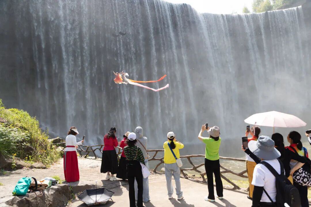 11岁的朱美珍小朋友是首发团里最活跃的游客之一。在岳池县低坑大瀑布景区,朱美珍在瀑布旁的汉服体验区换上一套汉服,系好威亚设备,在仙侠主题歌声中缓缓升空。脚下是奔涌激流,眼前是氤氲水雾,她在空中张开双臂,像一只飞鸟。“我一直有个‘飞天’梦,这次看到这里有威亚项目,毫不犹豫就体验了。”落地后,朱美珍兴奋地说。