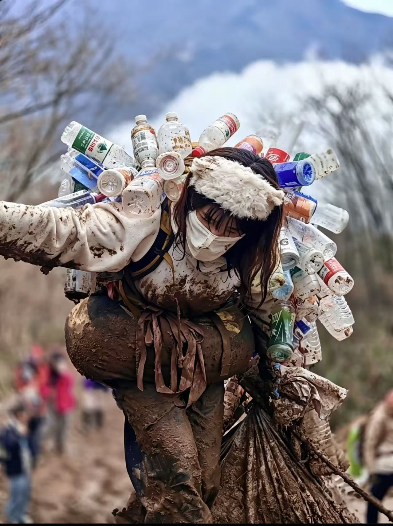 2025年末,一段“女子爬山下山拎着一串塑料瓶”的视频刷屏网络。画面中,一位姑娘一手拄着登山杖,一手拎着用绳子串起的二十多个塑料瓶,瓶身沾着泥土与松针。在陡峭湿滑的山路上,她走得缓慢,却始终没有松手——瓶身碰撞石阶的声响,清脆如山中风铃。另一段视频里,她双手提着装满垃圾的蛇皮袋,背上还挂着一串塑料瓶,小跑着下山,脚步轻快而自信。
