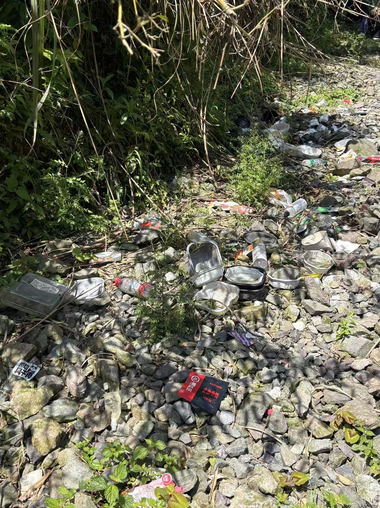 然而,与风景一同映入眼帘的,是令人沉默的另一番景象:靠近河谷一侧,吃完的自热米饭包装盒散落在石滩上,婴儿纸尿裤被塞进河滩石缝,塑料瓶、食品包装袋在溪流回水处聚成小小一堆,瓶身长满青苔,不知已在这里躺了多久。
