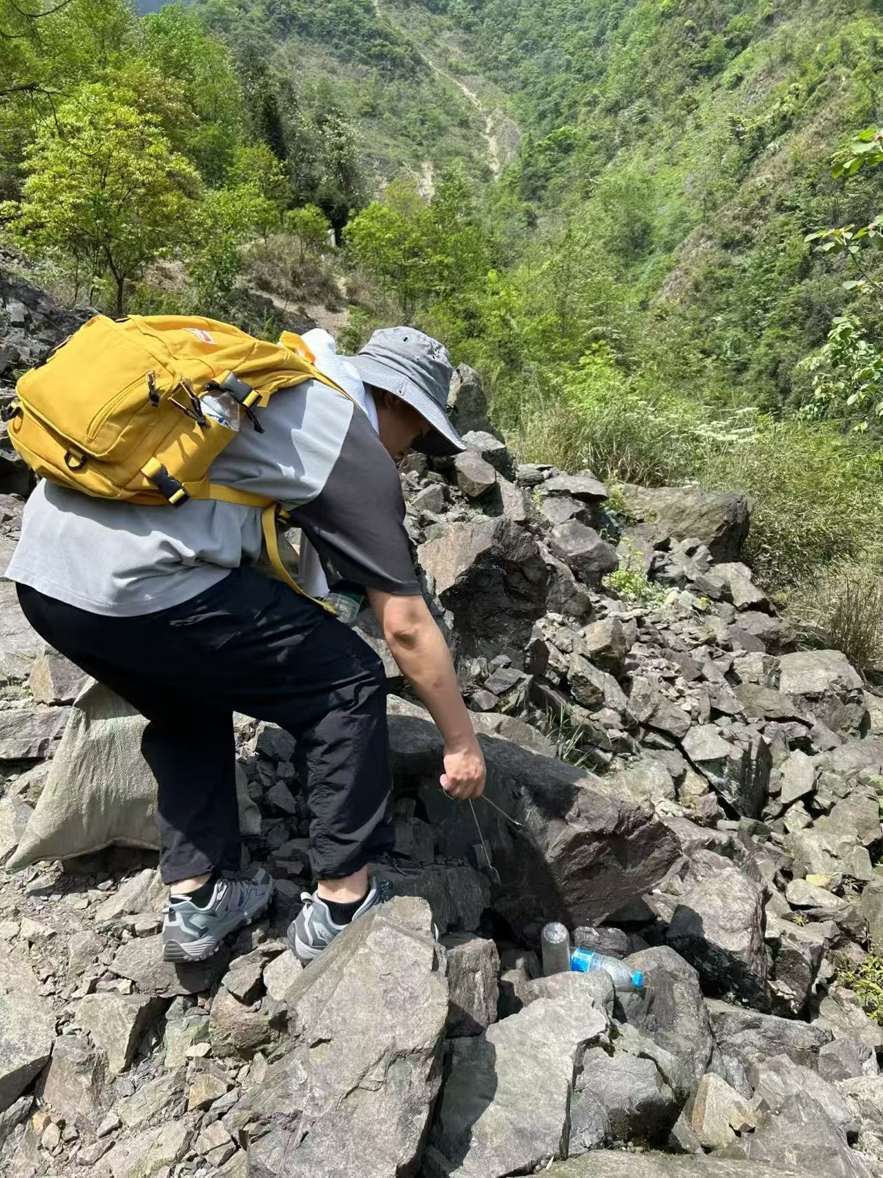 记者虽有徒步经验,却是第一次拖着装满垃圾的编织袋爬山。走到一段近60度的陡坡时,一手拄杖、一手拽袋根本行不通,只能先把编织袋推上去,再手脚并用地往上爬。
