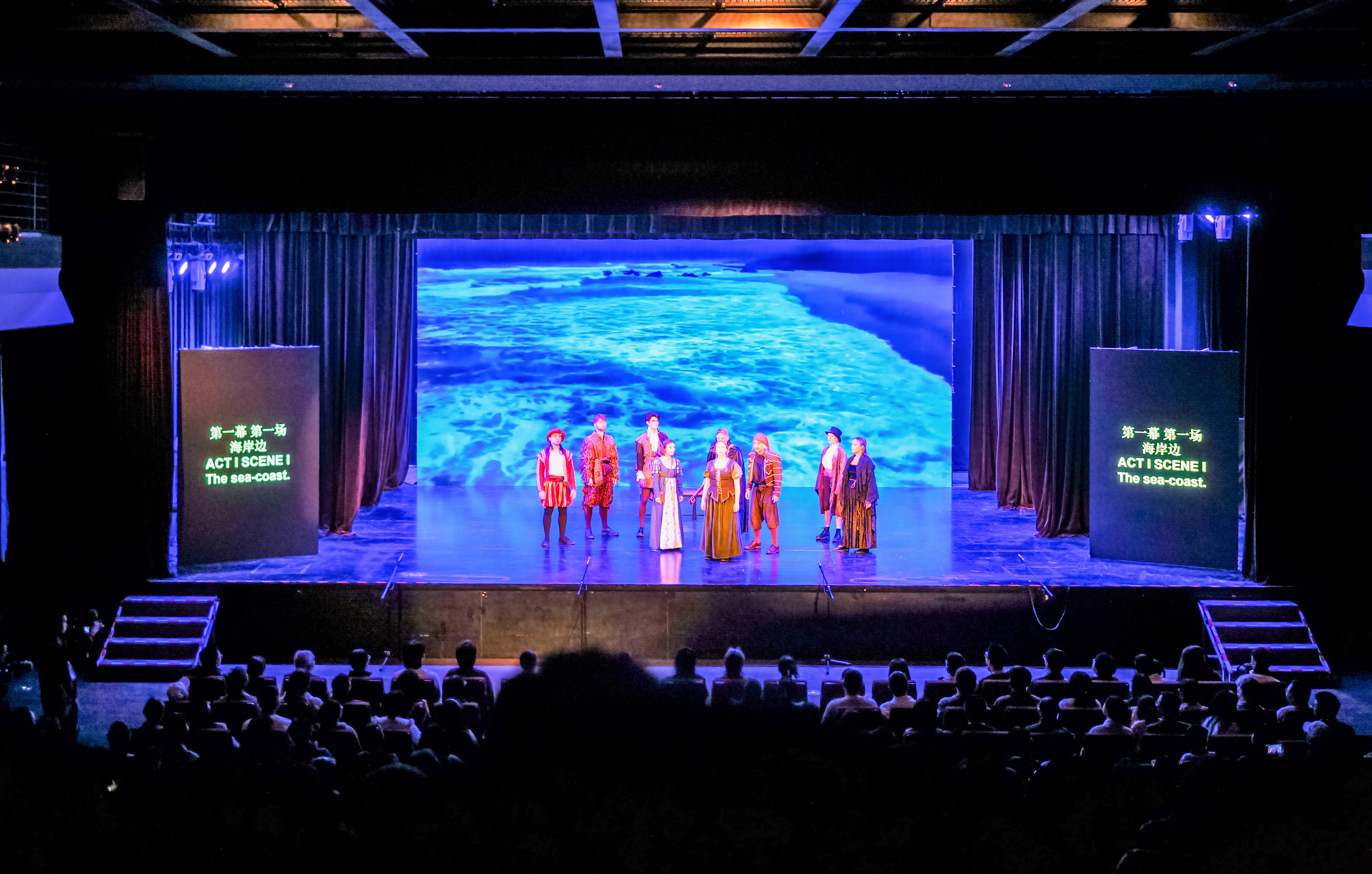 《第十二夜》以一场海难为缘起,讲述了薇奥拉女扮男装、机缘巧合步入公爵府后,引发的一系列身份错位、机缘巧合的温情故事,既有诙谐幽默的情节铺陈,也有对爱情、真诚与自我身份的细腻思考,是莎士比亚最具代表性的喜剧作品之一。演出现场,演员们以细腻传神的表演,将角色的情感起伏与性格特质展现得淋漓尽致:薇奥拉的聪慧忠诚、奥丽维亚的端庄炽热、奥西诺的忧郁浪漫,被演员们演绎得入木三分;而管家马伏里奥的刻板虚荣、弄臣费斯特的睿智诙谐,更带来诸多笑点,整场演出张弛有度、引人入胜,让观众在欢笑与暖意中感受跨越四百年的戏剧魅力。
