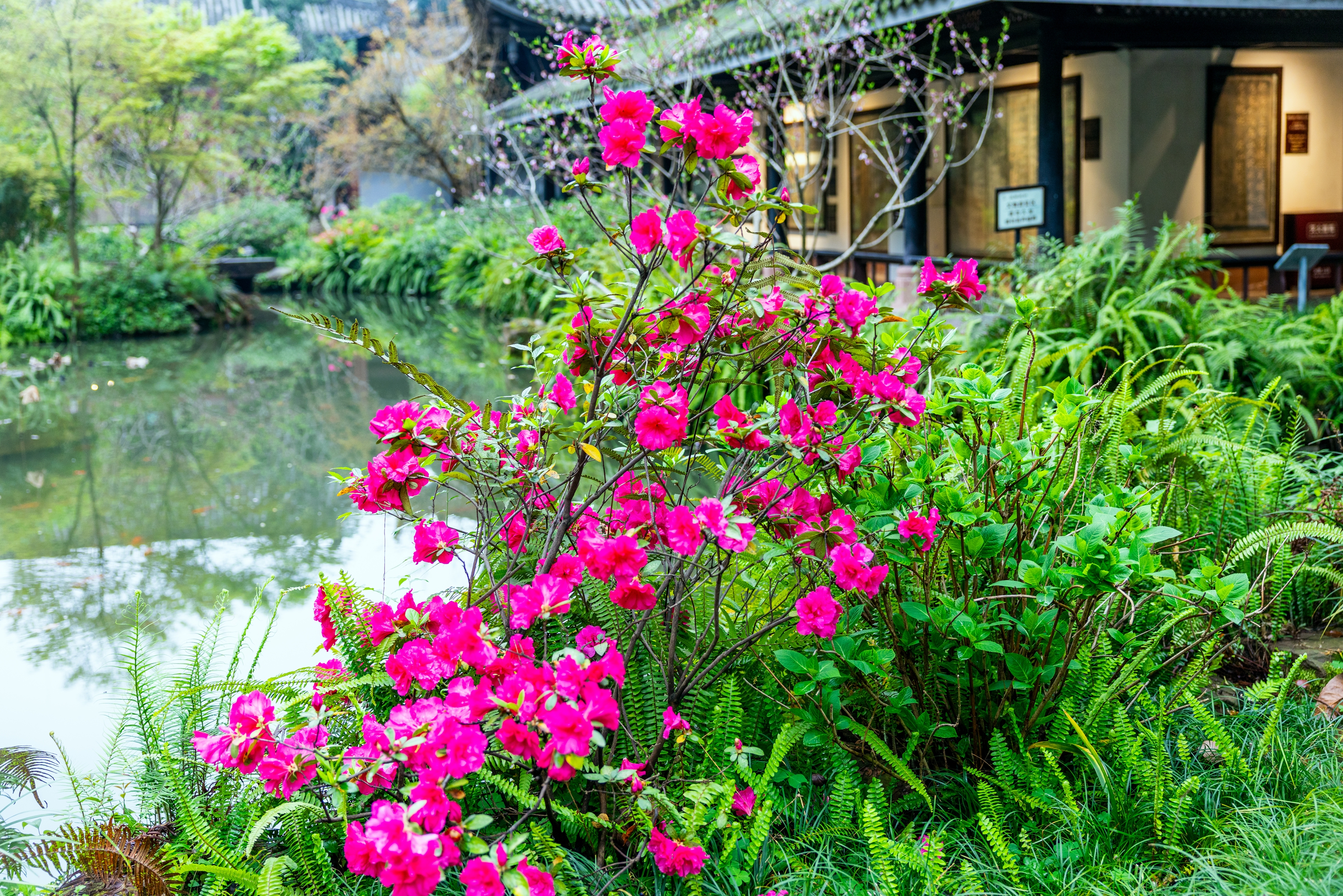 庭院之中,杜鹃开得正盛,一簇簇、一丛丛热烈绽放,艳红似火,粉紫如霞,深浅交错间,将古祠点缀得明艳动人。